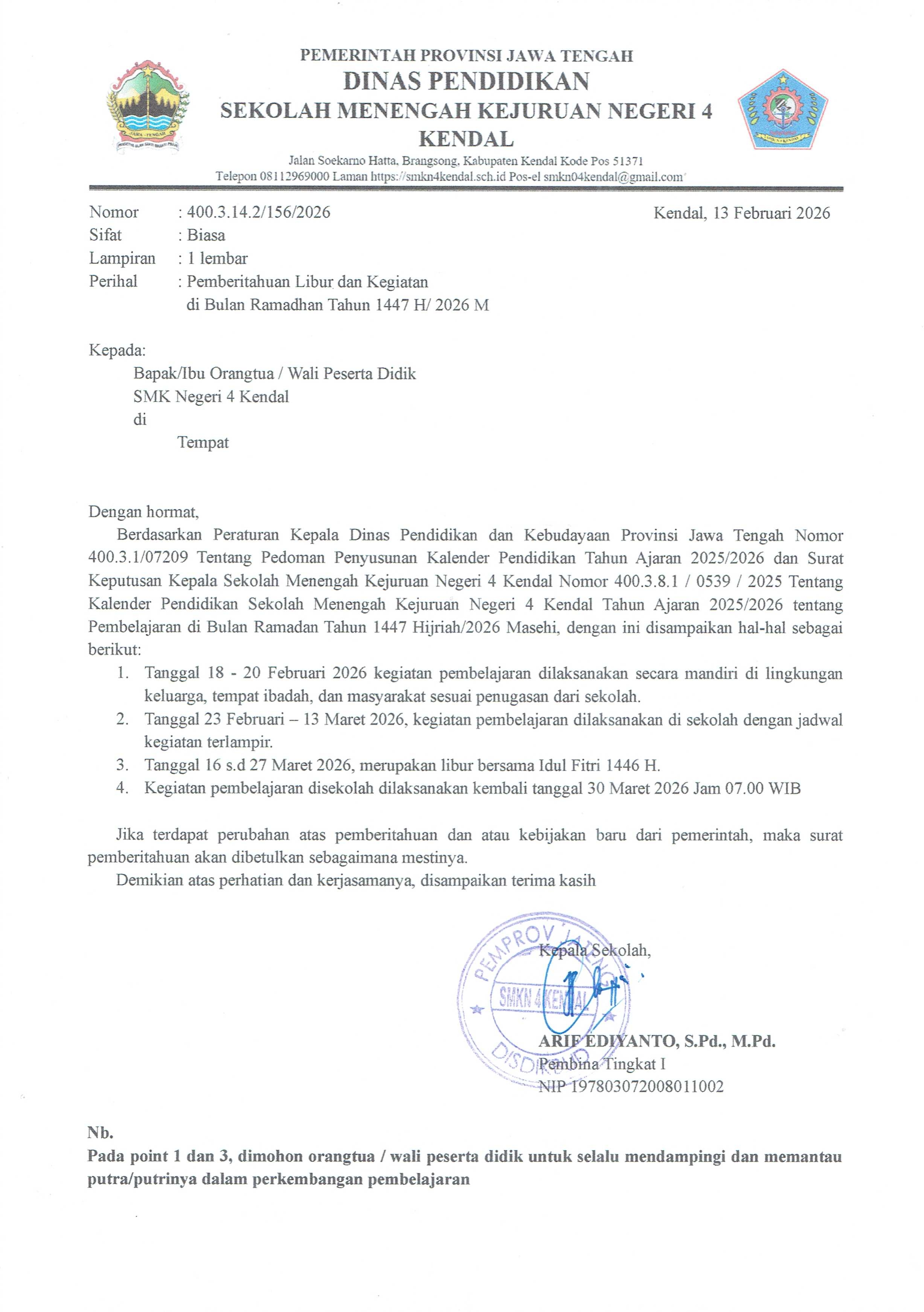 PENGUMUMAN HASIL SPMB Hai, teman-teman calon murid baru SMK Negeri 4 Kendal! Waktu yang ditunggu-tunggu akhirnya tiba juga! Pengumuman hasil Seleksi Penerimaan Murid Baru (